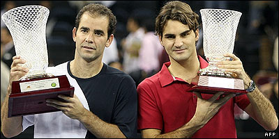 پیت سمپراس، تنیس باز شماره یک پیشین جهان و از پر افتخارترین ورزشکاران رشته تنیس، راجر فدرر، تنیس باز شماره یک حال حاضر جهان را 7-6، 6-4 شکست داد تا خاطرات سالهای اوج خود را دوباره زنده کند. سمپراس آمریکایی که در سال 2002 از مسابقات حرفه ای تنیس خداحافظی کرد، برای پیروزی بر فدرر، در هر دو ست، سرویس فدرر را شکست. سمپراس 36 ساله پس از مسابقه به شوخی گفت: "یک برد هم برای پیرمرد!" این مسابقه، سومین و آخرین از مجموعه مسابقاتی بود که در نقاط مختلف آسیای شرقی برگزار شد. در دو مسابقه قبل فدرر 26 ساله، در سئول سمپراس را 6-4، 6-3 شکست داده بود و در کوالا لامپور، با نتیجه 7-6 (8-6 در تای برک) و 7-6 (7-5 در تای برک) بر این ورزشکار غلبه کرد. فدرر در کنفرانس مطبوعاتی به ستایش سمپراس پرداخت و گفت: "سطح بازی بالا بود. نوع زمین سرعت توپ را بالا برد و پیت بسیار خوب و بدون اشتباه بازی می کرد." "در دو مسابقه قبل، بردن کسی که الگوی من بوده ساده نبود. خوشحالم که او من را حداقل یک بار شکست داد." سمپراس هم اضافه کرد: "نوع زمین به سرویس من کمک کرد، اما به خصوص در ست اول ممکن بود نتیجه به نفع هر کداممان تغییر کند." فدرر که در ماه سپتامبر سال جاری دوازدهمین عنوان گرند اسلم خود را در جریان مسابقات تنیس آزاد آمریکا برد، به تدریج به رکورد سمپراس که 14 گرند اسلم را برده است نزدیک می شود. این دو تنیس باز در مسابقات رسمی تنها یک بار و در جریان دور چهارم مسابقات ویمبلدون سال 2001 با هم رو در رو شدند که فدرر سمپراس را در پنج ست شکست داد. مقایسه افتخارات (تا 24 نوامبر 2007)
