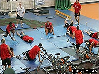 در این باشگاه، از برنامه هفتگی و کوتاه مدت تمرینات با عنوان ریزچرخه او می گوید: "روز بعد از بازی معمولا روز استراحت است، اما در سه روز بعد توجه بر روی کار فیزیکی بازیکنان خواهد بود. آنها روز اول را به کار با وزنه و افزایش قوای بدنی می گذرانند، روز دوم عمده کار بر روی تمرینات هوازی جهت افزایش استقامت است و روز سوم صرف کارهای سرعتی می شود." "پس از آن فشار فیزیکی کم می شود تا جایی که روز قبل از مسابقه تمرینات بدنی تنها یک ساعت خواهد بود و هدف اصلی آن افزایش هماهنگی عصب-عضله و کاهش زمان عکس العمل است." تمرین با توپ تمرینات با توپ با تمرین مفرح "خرس وسط" [یا "آقا وسط"] (Boxes) آغاز می شود، که تمرین مورد علاقه بازیکنان است اما درن فلچر بازیکن اسکاتلندی منچستریونایتد می گوید پس از گرم شدن خیلی سریع کار جدی می شود. "توجه به حفظ توپ و تاکتیکی که قرار است در بازی بعدی استفاده کنیم معطوف می شود." "در هر روز هفته تمرینات تغییر می کند و بازیکنان هر پست تمرینات تخصصی خود را انجام می دهند. هافبک ها، چهار به چهار، ارسال پاس از میان مدافعان را تمرین می کنند. مهاجمان سعی می کنند توپ را از میان شکاف ها عبور دهند و شوت کنند و یک تیم دیگر هم فقط بر روی عملکرد تیمی متمرکز می ماند." مایک فلان، مربی تیم اول می گوید: "بعضی چیزها حکم وحی منزل را دارند: همیشه در قسمت اول تمرین، بازیکنان تمرینات مفرح انجام می دهند. اما بعد بر روی برنامه های بازی بعد، یا نواقص بازی قبل تمرکز می کنیم." پس از آن و در تمرین نهایی، بسته به تعداد آسیب دیدگی ها، بازی 7 به 7 یا 10 به 10 انجام می شود که در آن بازیکنان در پستهای غیر تخصصی خود بازی می کنند. تمرینات مدرن