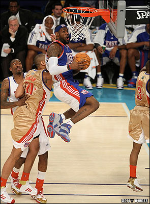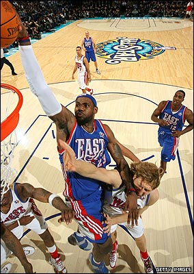 در مسابقه سالانه ستارگان کنفرانس شرق و غرب بسکتبال آمریکا، تیم شرق، با اتکا به لبرون جیمز، فوروارد سرشناس تیم کلیولند غرب را 134-128 شکست داد. این مسابقه، همراه با مسابقه های پرتاب سه امتیازی، دانک، مهارتهای شخصی و مسابقه سال اولی ها و سال دومی ها، در شهر نیو اورلئان برگزار شد و همراه با صحنه هایی جذاب بود.