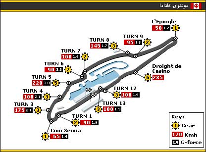 گراندپری کانادا یکی از پرطرفدارترین مسابقات در هر فصل از فرمول یک است. البته این پیست چندان رانندگان را به چالش نمی کشد، اما به طور کلی مسابقه در مونترال جذاب است.  | مکان: مونترال، کانادا تاریخ: ۲۷ ژوئن طول پیست: ۴.۳۵۹ کیلومتر رتبه (از ۱۰): ۸ |