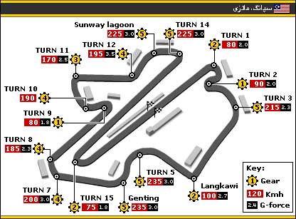 این پیست که در سال ۱۹۹۹ افتتاح شد، اولین پیست از سری پیست های فوق مدرن فرمول یک است که در ساخت آنها از تکنولوژی بسیاربالایی استفاده شده است.  | مکان: کوالالامپور، مالزی تاریخ: ۲۳ مارس طول پیست: ۵.۵۴ کیلومتر رتبه (از ۱۰): ۷ |