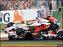 تعویض باله جلو سپس سوختگیری فیلیپه مسا باعث شد این راننده در انتهای قطار رانندگان قرار گیرد، اما در میانه مسابقه و در شرایطی که او خود را چند مکان بالاتر کشیده بود، تصادف او در هنگام سبقت در پیچ اول از دیوید کولتهارد، راننده ردبول، باعث آسیب دیدگی شدید اتومبیل کولتهارد و کناره گیری او از مسابقه شد. فیلیپه مسا هم کمتر از چهار دور بعد از این حادثه بعلت نقص فنی مجبور به خروج از مسابقه شد. کیمی رایکونن، قهرمان فصل گذشته مسابقات، که مسابقه را از مکان پانزدهم آغاز کرده بود، در دور اول خود را به مکان هشتم رساند، اما پس از آن برای رسیدن به مقام هفتم، به مدت 17 دور پشت سر روبنز باریکلو، راننده هوندا ماند.