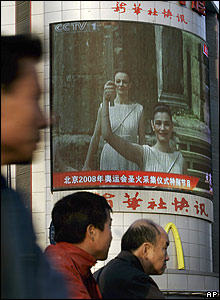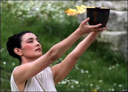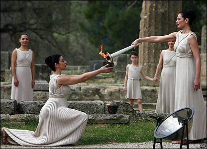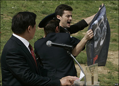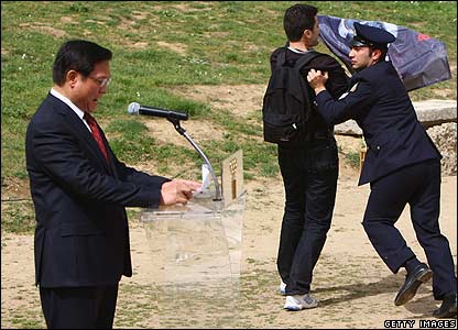 مشعل بازی های المپیک در پکن، طی مراسمی در محل المپیا در یونان روشن شد. اما در جریان این مراسم معترضان به سیاست دولت چین در قبال تبت، با وجود 1000 نیروی پلیس، از تدابیر امنیتی عبور کردند و تلاش کردند در هنگام سخنرانی نماینده چین، یک پرچم را نمایش دهند. فعالان مدافع حقوق بشر اعلام کرده بودند که بخاطر خشونت های ایجاد شده درون تبت و بخاطر آن، در مجامع عمومی اعتراض خواهند کرد.