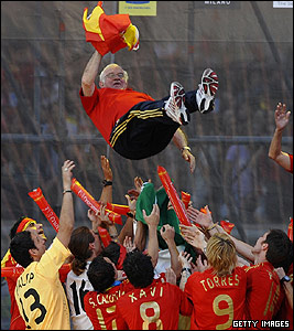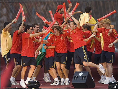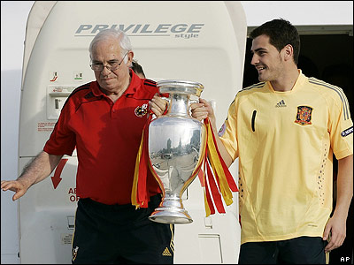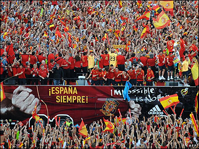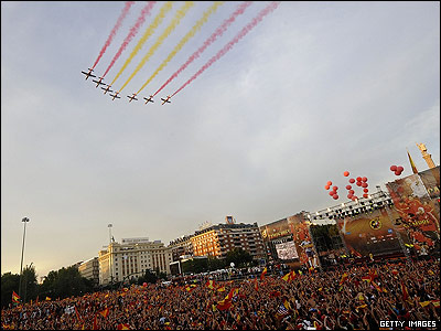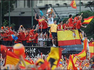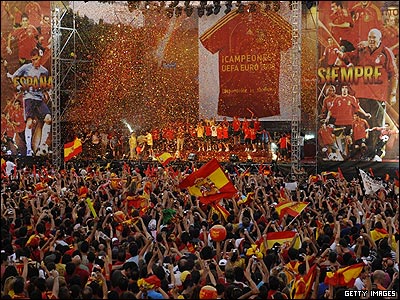 تیم فوتبال اسپانیا قهرمان جام ملتهای اروپا، در حضور حدود یک میلیون طرفدار پرشور خود به مادرید، پایتخت این کشور بازگشت. طرفداران ساعتها سر پا بودند و با تجمع در یکی از میادین اصلی مادرید در جشن قهرمانی تیم محبوب خود شرکت کردند. در این مراسم، حتی لوئیس آراگونز مربی معمولا آرام اسپانیا هم به وجد آمده بود و در آوازهای "استادیومی" مردم را همراهی می کرد.