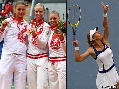 یکصد سال بود چنین صحنه ای در ایان هیچ رقابت تنیسی دیده نشده بود. النا دمنتیوا (وسط و عکس سمت راست، برنده مدال طلا)، دینارا سفینا (چپ) و ورا ووناروا، تنیس بازان روس، مدالهای رقابت های تنیس انفرادی المپیک را به دست آوردند تا برای اولین بار از المپیک 1908 لندن ورزشکاران یک کشور همه مدالهای این رشته را ببرند.
