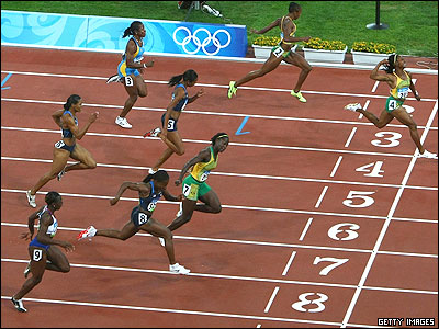 ورزشکاران جاماییکایی، یک روز پس از کسب اولین مدال طلای المپیک در رشته دو 100 متر مردان توسط اوسین بولت، در 100 متر زنان هر سه مدال را بردند. شلی ان فریزر اول شد، شرون سیمپسون دوم و کرون استوارت سوم.