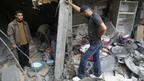 فلسطینیان در ویرانه های یک خانه که در حمله هوایی اسرائیل تخریب شده است
