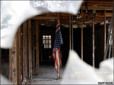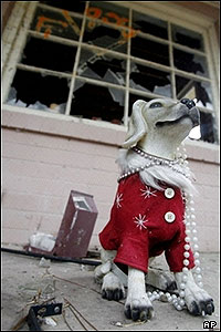 یک سگ پلاستیکی جلوی در خانه ای که از کاترینا ویران شده، نشانده شده است. جورج بوش، رئیس جمهور آمریکا، در دومین سالگرد کاترینا از نیواورلئان بازدید کرد.
