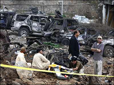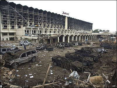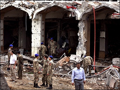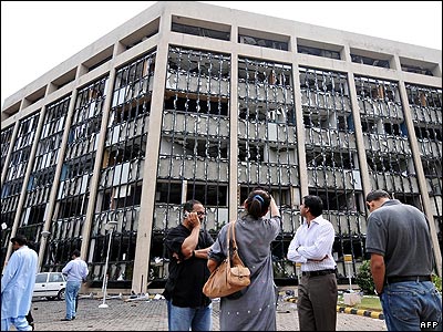 نمای ورودی هتل ماریوت اسلام آباد پس از انفجار. گودالی که در اثر انفجار ایجاد شده در عکس دیده می شود