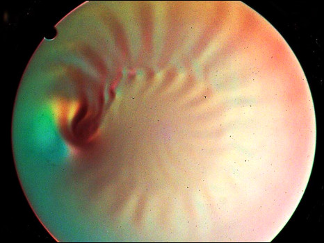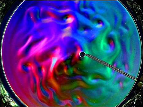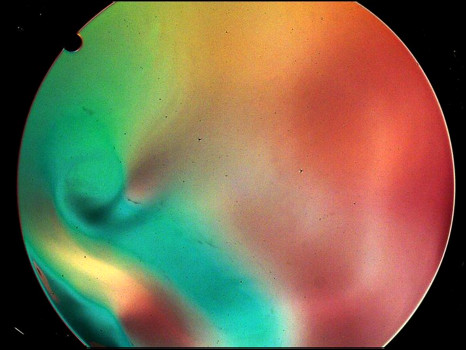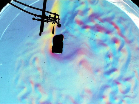 Um filtro colorido acima da plataforma permite aos pesquisadores codificar a topografia da superfície líquida – os movimentos, mesmo muito pequenos, aparecem em diferentes cores.