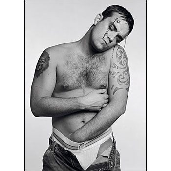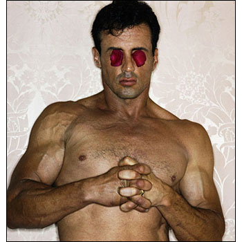 Assim, ele revela um lado delicado do musculoso Sylvester Stallone, clicando o ator com pétalas de rosa nos olhos, enquanto o cantor Robbie Williams posa seminu para sua câmera, com a calça jeans aberta e a mão dentro da cueca.