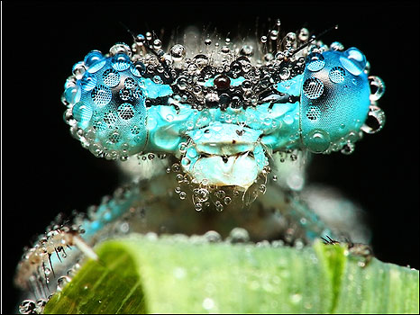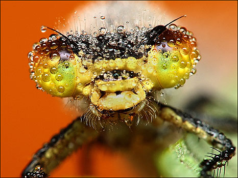 O fisioterapeuta polonês Miroslaw Swietek fotografou imagens da face de insetos coberta de orvalho.