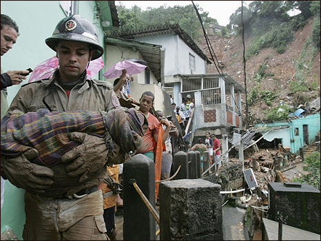 O governador carioca, Sérgio Cabral disse que a maioria das vítimas são os mais pobres, moradores em áreas de risco. Acima, bombeiro carrega bebê morto. (AP Photo/Fabio Gonçalves-Agencia O Dia)