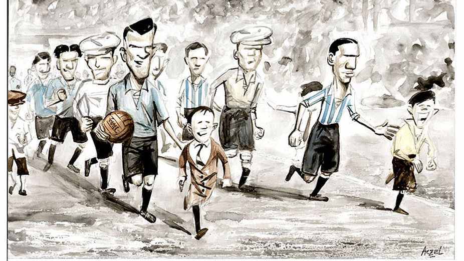 Este livro é de um fanático por futebol para outros diz o caricaturista argentino Germán Aczel, que recontou a história dos mundiais com seus desenhos. Acima, Argentina e Uruguai entram em campo na primeira final, em 1930, em Montevidéu.