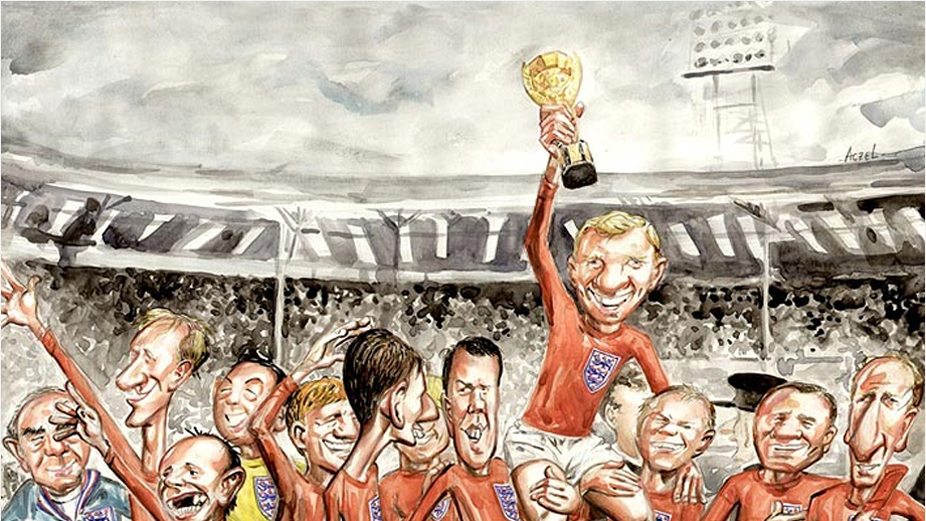 Bobby Moore levanta a Jules Rimet, carregado por seus colegas do time inglês, ao final da copa de 1966, no estádio Wembley em Londres. As imagens que escolhi foram as que mais me marcaram, diz Aczel.