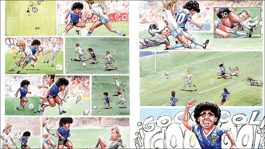 Chorei ao desenhar esse. Me lembrei do quanto este gol me marcou quando era garoto. Tinha doze anos e agradeço a sorte de viver na época em que Maradona jogava, diz ele referindo-se ao gol argentino contra a Inglaterra no México em 1986.