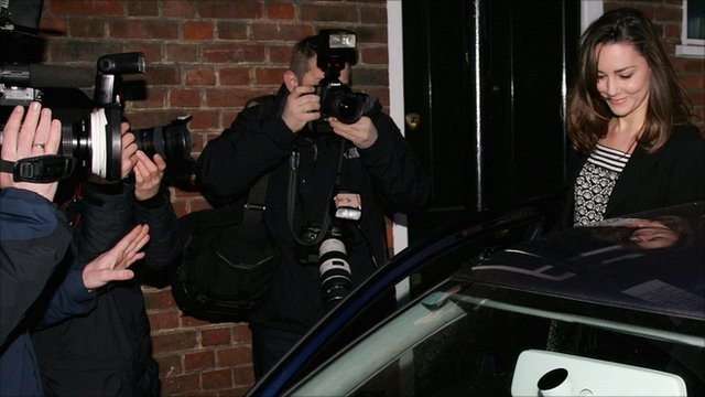 Um ano após o casal deixar a universidade, o interesse da mídia no relacionamento entre o futuro rei e Kate se intensificou. A aparição de Kate em vários eventos oficiais - como este na abertura de uma loja - inevitavelmente atraía fotógrafos.