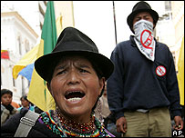 O governo do Equador declarou estado de emergência em cinco províncias do país para tentar conter a onda de manifestações de indígenas que se opõem às negociações com Estados Unidos para um tratado de livre comércio. A medida institui um toque de recolher e proíbe manifestações públicas nas províncias de Chimborazo, Cotopaxi, Imbabura, Cañar e em partes de Pichincha, onde fica a capital do país, Quito. Os índios equatorianos temem que Tratado de Livre Comércio (TLC) com os americanos venha a prejudicar a subsistência do país. A decisão do governo de Alfredo Palacio foi anunciada pelo ministro do Interior do Equador, Felipe Vega de la Cuadra. "O senhor presidente constitucional da República adotou a medida depois de esgotar todas as ações necessárias para conseguir que parte do movimento indígena contenha as suas atitudes, que causaram prejuízos econômicos e que ameaçam a segurança alimentar dos equatorianos", afirmou Vega de la Cuadra. 'Sem retroceder' No entanto, o líder indígena Gilberto Talahua assegurou que os protestos vão continuar assim mesmo. "Nós indígenas não vamos retroceder, e junto conosco estão vários setores sociais. A nossa luta é pelo país, não é por interesses particulares", afirmou Talahua à agência de notícias EFE. Na terça-feira, milhares de índios foram até Quito e bloquearam diversas rodovias importantes. A polícia chegou a usar gás lacrimogêneo para dispersar a multidão. A mobilização está sendo convocada pela Confederação de Nacionalidades Indígenas (Conaie), a principal associação indígena do Equador. O presidente da Conaie, Luis Macas, disse que a única maneira de evitar os protestos é convocar um referendo sobre o acordo com os Estados Unidos. "Não estamos dizendo que não assinem o acordo. Que seja assinado, se isso vai servir ao Equador, mas não aceitamos que se venda o nosso país, porque isso representa um controle dos nossos recursos naturais, da nossa soberania alimentar, territorial e política", disse Macas. A última rodada de negociações sobre o TLC acontece em Washington na quinta-feira. |