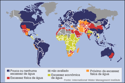 A alarmante extensão da escassez de água no mundo foi detalhada em um mapa elaborado por uma empresa de consultoria e gerenciamento de recursos hídricos. O mapa e o relatório elaborados pelo International Water Managment Institute (Instituto Internacional de Gerenciamento de Água, IWMI, na sigla em inglês) foram apresentados na Semana Mundial de Água em Estocolmo, na Suécia, que começou no domingo e vai até o dia 26 de agosto. O relatório Avaliação Compreensiva do Gerenciamento de Água em Agricultura do IWMI afirma que um terço da população mundial sofre com algum tipo de escassez de água. Segundo o relatório e o mapa existem dois tipos de escassez de água. A escassez econômica ocorre devido à falta de investimento e é caracterizada por pouca infraestrutura e distribuição desigual de água. A escassez física ocorre quando os recursos hídricos não conseguem atender à demanda da população. Regiões áridas são as mais associadas com a escassez física de água. Escassez artificial O IWMI afirma que há uma tendência alarmante na criação artificial de escassez de água, mesmo em áreas onde a água é aparentemente abundante. Isto ocorre principalmente devido ao uso exagerado do recurso. A agricultura usa 70 vezes mais água para produzir alimentos do que as residências, incluindo a água usada para cozinhar, beber, lavar e banhos. Os resultados deste consumo são rios secos e poluídos, declínio nos níveis de águas subterrâneas e problemas de distribuição, que geram problemas como um grupo de pessoas tendo acesso mais fácil à água do que outro. Catástrofe ambiental O Egito importa mais da metade de seus alimentos pois não tem a água necessária para sua produção local. E o Mar de Aral, entre o Uzbequistão e o Cazaquistão, continua sendo um dos exemplos mais visíveis em que desvios enormes de água para a agricultura causaram escassez, segundo o relatório, além de uma catástrofe ambiental. "É possível reduzir a escassez de água, alimentar as pessoas e cuidar da questão da pobreza. Mas a questão mais importante é a ambiental. O povo e seus governos terão que tomar decisões sobre como gerenciar a água", disse o pesquisador David Molden, do IWMI, que liderou a avaliação. O diretor-geral do instituto, Frank Rijsberman, disse à BBC que 25% da população mundial vive em bacias hidrográficas onde há escassez física de água. Um bilhão de pessoas vivem em bacias hidrográficas onde a água é economicamente escassa. Demanda crescente A avaliação afirma que a urbanização e o crescimento econômico significam que a demanda per capita por alimentos vai aumentar, além da demanda por alimentação mais rica e variada. A produção de leite, carne, açúcar, óleos e vegetais exige mais água que a produção de cereais além de um gerenciamento diferente dos recursos hídricos. Segundo David Molden destinar mais água para agricultura e expandir a área total de cultivo e criação, para responder ao crescimento na demanda por alimentos, pode significar um preço alto demais para o ambiente. O relatório pede que agricultores cultivem mais alimentos sem pressionar ainda mais o ambiente.