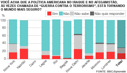 Os jovens da capital iraquiana são também os que se disseram menos dispostos (50%) a mudar de país em busca de uma vida melhor. Os que mais gostariam de mudar são os jovens (81%) de Nova Déli e Jacarta. Ainda relacionado ao tema imigração, uma questão que mostrou uma grande diferença nas opiniões de jovens de países ricos e pobres é se os imigrantes deveriam se adaptar ou não à cultura do país para onde emigram. Em Nova York, 61% são a favor da integração, mas em Nova Déli, 81% disseram que os imigrantes devem manter seus valores e tradições. Terror Apenas 1% dos jovens de Bagdá responderam ‘sim’ à seguinte pergunta: "A política americana no Afeganistão e no Iraque, a chamada 'Guerra contra o Terror', torna o mundo mais seguro?". A tendência de duvidar dos objetivos da chamada 'Guerra contra o terror' foi observada entre os jovens das outras cidades. 71% dos jovens ouvidos em todas elas responderam com um 'não' a pergunta acima. Em Nova York, 16% responderam que sim e 62% que não.