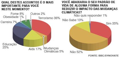 As impressões mais positivas à política americana foram registradas em Nairóbi, onde 26% chegaram a responder afirmativamente à questão. Quando perguntados se considerariam tomar uma atitude que pudesse resultar na morte de inocentes, 25% dos londrinos responderam que sim, acima da média mundial de 17%. Aquecimento global Quase metade de todos os jovens pesquisados (48%) não entendem ou não ouviram falar de aquecimento global. Dos 51% que entendem o tema, apenas 5% o consideram o maior problema global. 62% dos que se dizem cientes do problema acreditam que ele é causado pelo homem, mas apenas 34% estariam preparados a fazer concessões em seus estilos de vida para melhorar a situação.