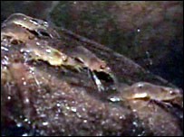 Milhões de camarões lutam contra os obstáculos em uma longa caminhada do leito de um rio até o topo de uma colina, no nordeste da Tailândia. O objetivo dessa marcha inusitada é a procriação em massa para a manutenção da espécie. O "desfile" de camarões acontece todo ano em setembro, sempre depois do pôr-do-sol, e dura até o amanhecer. O fenômeno já está atraindo muitos turistas para a região. |