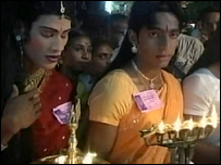 Centenas de homens travestidos de mulher participam de um ritual religioso único em Kerala, na Índia. O objetivo da curiosa cerimônia é realizar os desejos dos devotos. Eles visitam o templo da deusa Kottankulangara em procissão, com velas acesas e vestindo roupas femininas que incluem saris e um tradicional robe local chamado settu mundu. Carregar uma lanterna com cinco velas montadas sobre um pedaço de madeira também faz parte da tradição. Elas são usadas para acender as outras velas do templo. A tradição de se vestir de mulher teria começado com um grupo de pastores que costumava imitar meninas tímidas e oferecer flores e cocos para a entidade. Um dos rapazes teria tido uma visão da deusa e, então, construído um templo aberto. |