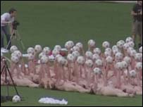 Quase 2 mil pessoas posaram no domingo em um nu artístico em massa para o fotógrafo americano Spencer Tunick, em um estádio de futebol em Viena, na Áustria. O fotógrafo pediu que as pessoas não usassem óculos escuros, roupas íntimas e que ficassem sérias. Durante horas, os voluntários posaram de várias maneiras, conforme dirigia o fotógrafo. Em uma das fotos, as mulheres aparecem deitadas no gramado segurando bolas de fotebol. Spencer Tunick é famoso por suas fotografias de centenas de pessoas nuas em lugares inusitados. |