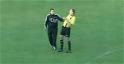 Um árbitro de futebol foi suspenso por estar supostamente bêbado enquanto trabalhava em uma partida de um campeonato nacional em Belarus. O árbitro Sergei Shmolik foi levado para fora do campo e deixou o gramado acenando para a torcida. A princípio, pensava-se que Sergei Shmolik estava com dor nas costas. Mas testes em um hospital revelaram que o árbitro tinha alta concentração de álcool no sangue. |