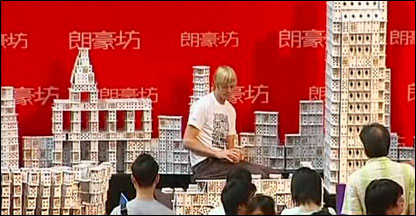 Usando 140 mil cartas de baralho, o americano Brian Berg está construindo em um shopping center de Hong Kong maquetes da vila olímpica e de vários outros prédios marcantes de Pequim. Para realizar a façanha, o artista americano vai trabalhar 20 dias seguidos por oito horas diárias e não vai usar qualquer cola ou fita adesiva. Isso, no entanto, não significa que a obra dele seja frágil. Berg utiliza uma técnica especial que faz as cartas comuns suportarem quase 110 quilos – duas pessoas e ainda uma imitação de pódio. Berg já construiu com cartas um castelo de Cinderela, uma paisagem de Nova York e até uma torre de quase 8 metros de altura – que rendeu ao americano uma entrada no Livro Guiness dos Recordes. A obra vai ficar em exposição ao público de Hong Kong até o fim de julho. |
