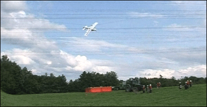 Duas pessoas foram resgatadas de um pequeno avião que se chocou contra fios de alta tensão perto da cidade de Durach, na Alemanha. Levou duas horas para as equipes de resgate retirarem os passageiros da aeronave, que estava pendurado nos fios a 30 metros do solo. Os passageiros tiveram que esperar dentro do avião até que uma plataforma mecânica fosse levada ao local. As equipes de resgate decidiram não usar um helicóptero porque causaria muito vento, o que poderia fazer o avião se desprender e cair. |