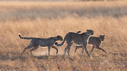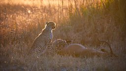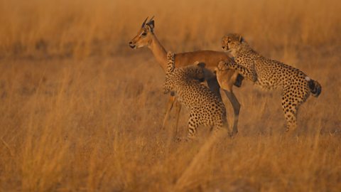 A cheetah mum teaches her cubs how to kill their prey