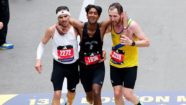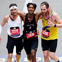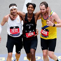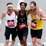 Aaron Beggs and Robson De Oliveira stopped to help carry an exhausted Ajay Haridasse over the finish line.