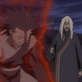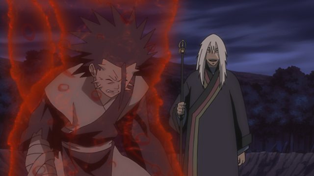 Naruto and Asuma catch up to Sora, only to find him shrouded in ominous chakra and undergoing a change. Naruto is shocked when Furido reveals the secret of Sora’s birth. Ten years earlier, remnants of the Nine Tails’ chakra that could not be sealed inside Naruto had been placed inside Sora. Imagining the suffering of one who shares the same fate as he, Naruto explodes with anger. This betrayal by one he trusted is the last straw for Sora, and he falls into despair.