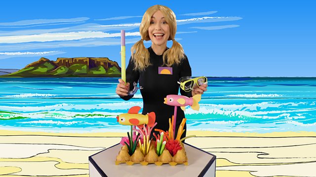 Murphi thinks he has seen an alien in the attic, but it’s only Rebecca pretending to be an underwater ocean explorer. Water inspires the first monster make of the day – a sea turtle bowl. The Mini Monsters are inspired by water too, transforming different-shaped boxes into boats. Rebecca’s cousin is by the sea, turning discarded rubbish from the beach into a fantastic seascape. Finally, Rebecca and Murphi create a manta ray from an old plastic bottle, with the Tiny Helpers lending a hand.