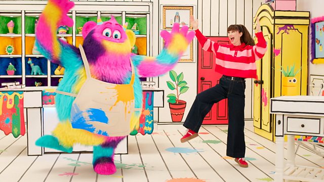 Rebecca and Murphi are trying to come up with a new move to perfect their competition dance routine. They take a break for an ice-cold monster shake and find time to create a bottle penguin. The Mini Monsters demonstrate how to make everlasting sandcastles, and Rebecca’s aunt calls from space - where she has made some alien friends. The Recycling Express arrives with empty tissue boxes, inspiring a mega monster make – a funny pineapple puppet.