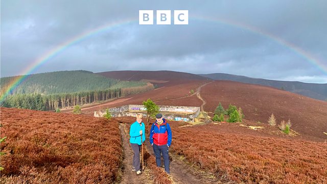 Stewart begins today’s walk at Innerleithen Parish Church on Leithen Road. From there he then leads Clare over Leithen Water at Cuddy Bridge and, after a couple of stiff climbs through a forestry plantation with trees creaking in the wind, arrives at the disused relic of Kirnie Law reservoir. It's a great view point, which thanks to the rainy, sunny, sleety weather, created a full rainbow over the heathery hills beyond. It's a circular route that takes them back down to Innerleithen, just over five miles in total.