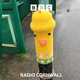 Neil Caddy speaks to Joy and Leslie after knitted bollard covers were taken in Carnon Downs.
