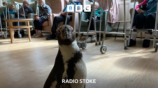 Two Humboldt penguins took their final visit to Hilton House care home in Stoke-on-Trent. Pringle and Widget spent their time sitting on laps and having pictures taken with residents. BBC Reporter Ethan Saunders was there to find out what people made of them.