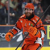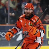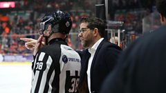Sheffield Steelers defenceman Kevin Tansey speaking to Peter Spencer, after scoring a brace in their 8-1 win over Glasgow Clan.