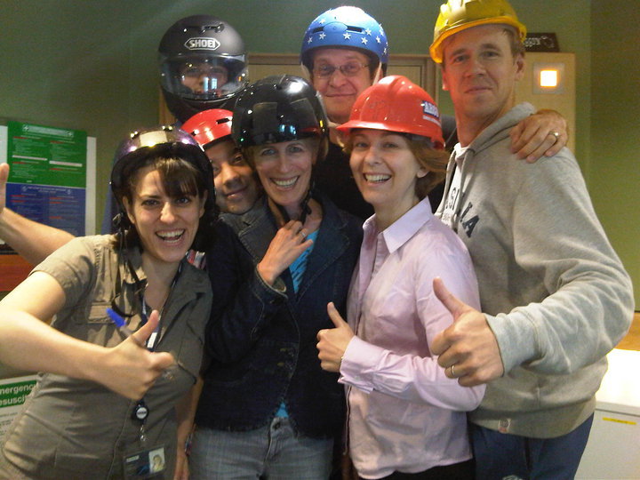 NATIONAL HELMET DAY. From left to right: Exec Producer Helen, Day, Joe Schmo squeezing in, Suzie-Suze, Studio Manager Guy, L-Bo and Jonny the Sport.