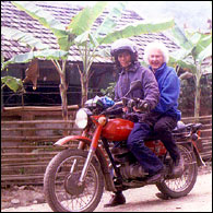Margie rides pillion on Dyuen's bike in Vietnam |  |