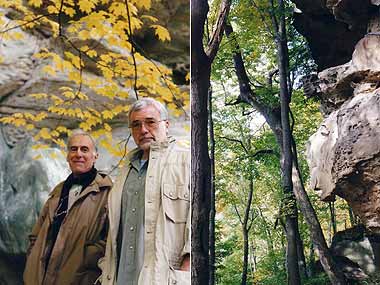 | Left: Presenter, Aubrey Manning with archaeologist Dr James Adovasio Right: The cliff near the Meadowcroft Rock Shelter in Pennsylvania is still much as it would have been when humans first visited it, maybe 16,000 years ago. |
