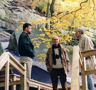 | David Scofield, Aubrey Manning and Jim Adovasio on the steps leading up to the Meadowcroft excavations. |