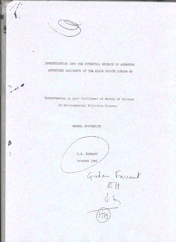 Among the more interesting is a Masters thesis about the tower blocks prepared by Graham Farrant, while he was a senior environmental health officer working for Westminster City Council. We have a copy of the thesis, entitled: "Investigation into the potential release of asbestos affecting residents of the Elgin Estate, off Chippenham Road, London W9". Mr Farrant worked for the Housing Department of Westminster City Council when homeless people were being moved into the tower blocks, Hermes and Chantry Points, which were on the Elgin Estate, off Chippenham Road, London W9. Click on the document on the right hand side to see what he said.