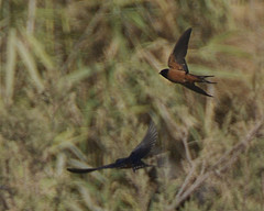 Unlike most other passerines (perching birds) they are diurnal migrants, travelling at almost ground level and skimming the waves whereas most migrants move at a height of several thousand feet. When they drink they skim low over the surface scooping water with open mouths. They breed in the Northern Hemisphere and then migrate south again for the winter.