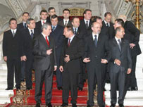 Ion Iliescu a adăugat că o altă încălcare a Constituţiei ar fi faptul că Traian Băsescu nu a prezentat o strategie de securitate naţională, în primele 6 luni de la preluarea mandatului de şef al statului. Liderul PSD, Mircea Geoană, declara că săptămâna viitoare, partidul pe care-l conduce ar putea depune la Birourile Permanente ale celor două Camere ale Parlamentului, cererea de suspendare a preşedintelui Băsescu. Cererea este semnată de parlamentarii PSD şi PRM, iar Partidul Conservator a anunţat că va vota pentru suspendarea lui Traian Băsescu. | LEGĂTURI PSD amână prezentarea moţiunii de suspendare29 Ianuarie, 2007 | Ştiri Ion Iliescu îl atacă dur pe Traian Băsescu23 Ianuarie, 2007 | Ştiri Guvernul României a depus jurământul29 Decembrie, 2004 | Ştiri PUR s-a hotărât pentru guvernare alături de PNL-PD23 Decembrie, 2004 | Ştiri Călin Popescu Tăriceanu este noul premier desemnat22 Decembrie, 2004 | Ştiri LEGĂTURI LA SITE-URI EXTERNE BBC nu este răspunzător de conţinutul paginilor de Internet ce nu îi aparţin | |||||||||||||||||||||||||||||||||||||||||||