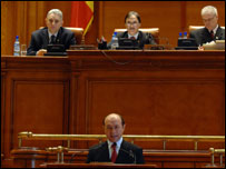 "În legătură cu scrisoarea transmisă de dumneavoastră la data de 20 februarie 2007, prin care mă informaţi despre depunerea la Birourile permanente ale Camerei Deputaţilor şi Senatului a propunerii de suspendare din funcţie a Preşedintelui României, semnată de 182 de deputaţi şi senatori, admit dreptul constituţional al Parlamentului de a recurge la un asemenea gest politic. Apreciez însă că prezenţa mea în Parlament, cu această ocazie, nu este necesară", se spune într-o scrisoare trimisă de Preşedintele Băsescu Preşedinţilor celor două camere ale Parlamentului. "Consider că toate acţiunile şi declaraţiile pe care le-am făcut de la începutul mandatului meu, în calitate de Preşedinte al României, sunt conforme cu ordinea constituţională", mai spune Preşedintele României "Avizul Curţii Constituţionale va lămuri dacă faptele ce mi se impută reprezintă sau nu „încălcări grave ale Constituţiei”, aşa cum votul membrilor Parlamentului va clarifica situaţia raporturilor mele cu această instituţie, iar votul popular, în cazul unui referendum, va confirma sau nu temeinicia demersului politic iniţiat de cei 182 de senatori şi deputaţi", se afirmă în scrisoare, Preşedintele încheiând, "Vă asigur că îmi doresc în continuare o relaţie corectă cu Parlamentul, care să servească consolidarea statului de drept şi realizarea interesului naţional". Cum ar trebui să voteze parlamentarii la propunerea de suspendare din funcţie a Preşedintelui României? Dacă moţiunea este adoptată, cum veţi vota la referendumul de demitere? | LEGĂTURI În ce condiţii pot avea loc cele două referendumuri?15 Februarie, 2007 | Ştiri Preşedintele se adresează Parlamentului14 Februarie, 2007 | Ştiri Procedura suspendării13 Februarie, 2007 | Ştiri Opoziţia susţine suspendarea preşedintelui24 Ianuarie, 2007 | Ştiri Ce este suspendarea din funcţie a Preşedintelui României21 Ianuarie, 2007 | Ştiri PSD iniţiază suspendarea preşedintelui Băsescu18 Ianuarie, 2007 | Ştiri LEGĂTURI LA SITE-URI EXTERNE BBC nu este răspunzător de conţinutul paginilor de Internet ce nu îi aparţin | |||||||||||||||||||||||||||||||||||||||||||