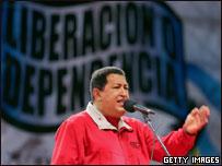 Hugi Chavez face şi el un turneu paralel în America Latină. El s-a adresat mai multor mii de argentinieni la Buenos Aires declarând că America Latină trebuie să se unească pentru a lupta împotriva influenţei Statelor Unite. Hugo Chavez a declarat că preşedintele Bush reprezintă varianta americană a doctrinei din secolul al XIX-lea care încerca să prevină colonizarea Americii de către europeni. "El reprezintă doctrina Monroe pentru americani. Dar noi trebuie să îi atragem atenţia că America de nord este pentru nord-americani şi America de Sud este pentru sud-americani. Aici e America noastră", a declarat liderul venezuelean în faţa a 30.000 de argentinieni. Hugo Chavez a insistat că este o simplă coincidenţă că a ales să facă un turneu în ţările Americii Latine chiar în acelaşi timp cu preşedintele Bush dar corespondenţii subliniază că ambii lideri sunt prinşi într-o luptă pentru a câştiga simpatia Americii Latine. Iar Hugo Chavez nu a ocolit nici calea atacului verbal. El a declarat că preşedintele Statelor Unite este acum un cadavru politic, spusele sale primind aprobarea argentinienilor prezenţi la miting. Luptă pentru simpatia Americii Latine George Bush a declarat că turneul său în America Latină e menit să promoveze relaţii de bună vecinătate cu ţările din regiune.