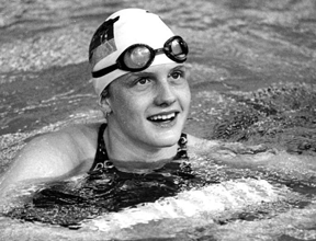 Американка Сибил Бауэр получает "золото" в заплыве на 100 метров на спине. Двумя годами раньше она стала первой спортсменкой, побившей установленный мужчинами мировой рекорд.